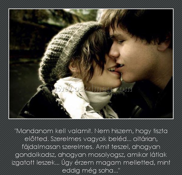 - "Mondanom kell valamit. Nem hiszem, hogy tiszta előtted. Szerelmes vagyok beléd... oltárian, fájdalmasan szerelmes. Amit teszel, ahogyan gondolkodsz, ahogyan mosolyogsz, amikor látlak izgatott leszek... Úgy érzem magam melletted, mint eddig még soha..."