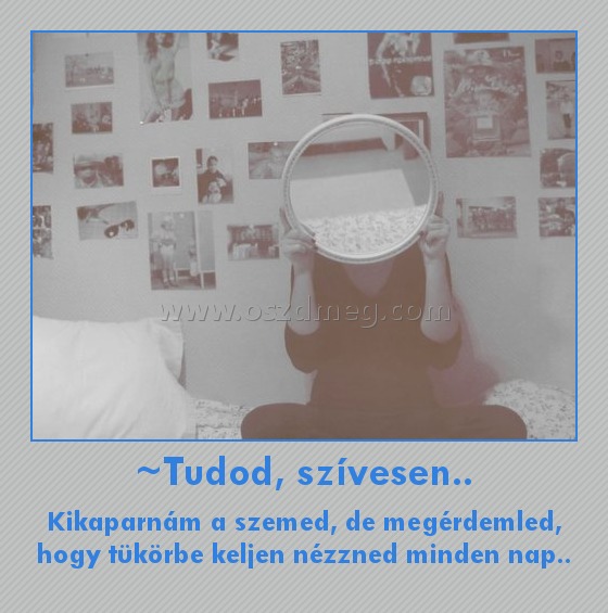 Tudod milyen érzés az.. - Amikor valaki, akit szeretsz ott van melletted, mégis mintha egy hatalmas szakadék lenne köztetek? Hogy milyen, amikor írsz Neki és napokig várod a választ, majd rádöbbensz, hogy hiába vársz, mert nem fog írni? Hogy milyen mikor nagy nehezen elhiszed, hogy veled jó is történhet, aztán egy napon ráébredsz arra, hogy mégis hazugság volt az egész? Hogy milyen az, amikor legszívesebben mindent elmondanál, de mégsem teszed, mert tudod, hogy Ő nem így érez; és mert úgy gondolod, hogy ha nem mondod ki, akkor nem is igaz? Hogy milyen, mikor el kell engedned valakit, aki soha nem is volt igazán a tiéd, de mégis az életed része volt? Nem ugye? Neked fogalmad sincs ezekről az érzésekről. Te csak a felszínt látod belőlem, az álarcomat, amit azért öltöttem magamra, hogy ne lásd mennyire fáj az, amit velem teszel. A gondolataimban és a szívemben zajló harcok, küzdelmek Téged nem érdekelnek, megelégszel azzal, hogy látszólag minden rendben.